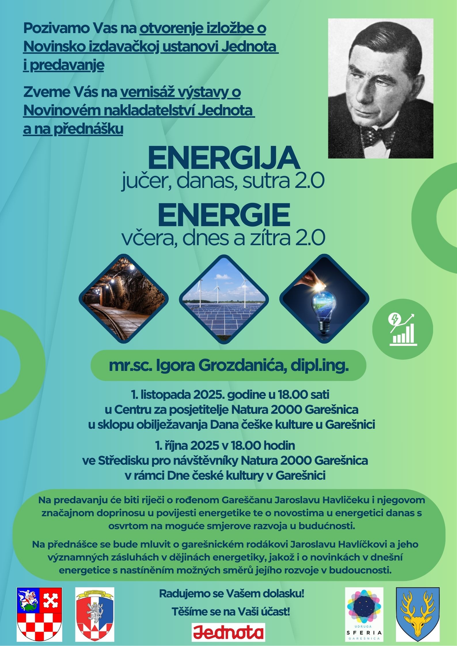 S ponosom Vas pozivamo u Centar za posjetitelje Natura 2000 Garešnica u srijedu 1. listopada 2025. godine u 18.00 sati na otvorenje izložbe o Novinsko izdavačkoj ustanovi Jednota i predavanje Energija jučer, danas, sutra 2.0, a u povodu obilježavanja 146. obljetnice rođenja inženjera i inovatora Jaroslava Havličeka.